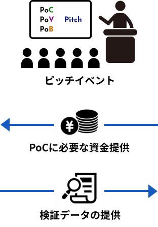 PDAではPoCピッチイベントを通して、⽇本におけるスタートアップ投資効率を⾼める活動を⾏います。