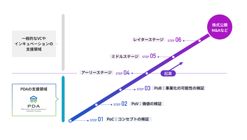 PDAでは支援のステージを3段階に分け、各ステージを検証しながら判断を行うことで、その先に投資効率の高いスタートアップを生み出すことを目指します。